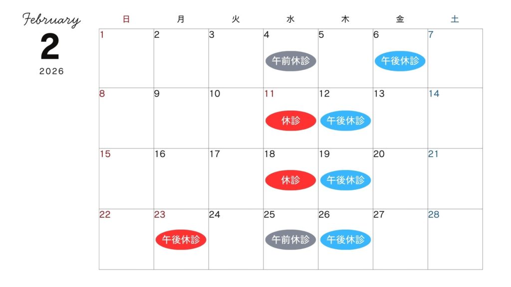 2026年2月の《休診》と《獣医師の出勤予定》のお知らせです。