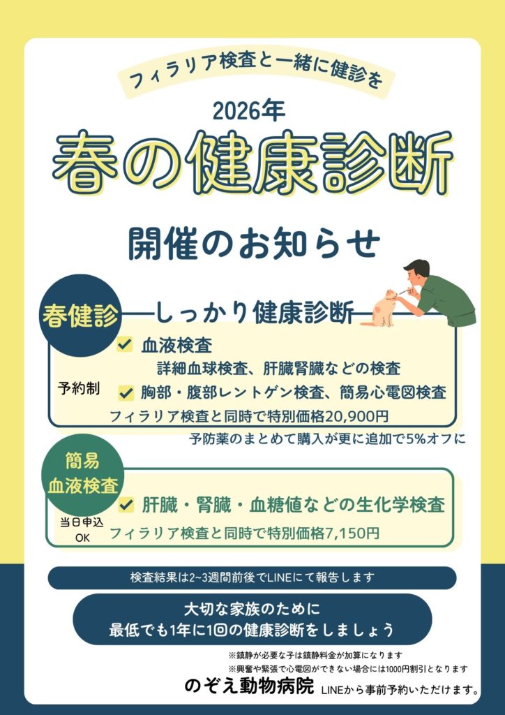 春健診をするとフィラリア等の予防薬のまとめての購入時に+5%割引になります。